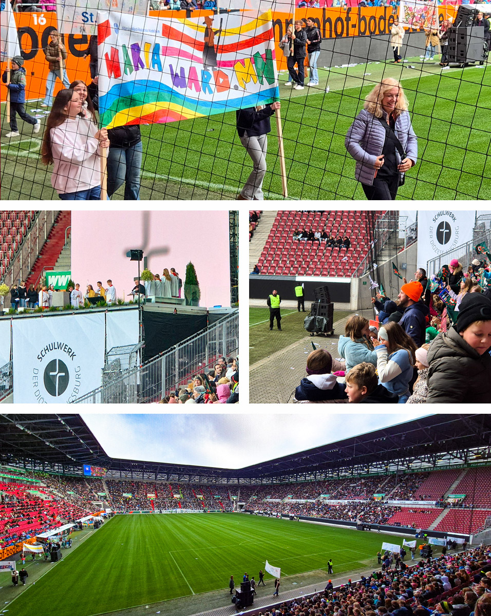 WOW – Alle Schulen des Schulwerks kamen am vergangenen Freitag in der WWK-Arena zusammen und feierten das 50-Jährige Jubiläum des Schulwerks Augsburg zusammen mit Bischof Bertram Meier. Rapperin Rubi, der Musical-Sänger Lukas Mayer und der Songwriter Levent Geiger sorgten nach einem gemeinsamen Wortgottesdienst für beste Stimmung in der Arena, sodass über 23.000 Menschen im Augsburger Stadion eine überwältigende Atmosphäre erleben durften! Teilt eure Fotos von diesem unvergesslichen Tag mit #50JahreSchulwerk und lasst uns gemeinsam das größte Schul-Fotobuch aller Zeiten füllen!