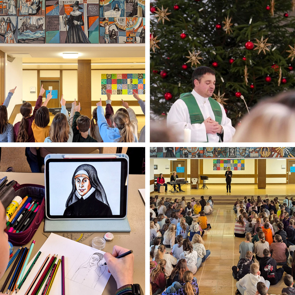 Beim diesjährigen Maria-Ward-Tag begaben sich unsere Schülerinnen und Schüler in mehrfacher Hinsicht auf Spurensuche. Beim Schauspiel „Mary Ward – mein Weg“ erzählte eine Truppe talentierter junger Schauspielerinnen auf der Bühne des Merzweckraums von zentralen Wegmarken aus dem Leben der Ordensgründerin, die – ihrer Zeit voraus – schon im 17. Jahrhundert der festen Überzeugung war, dass Frauen im Dienst Gottes „viel tun können“. Dass die Ordensschwestern dieser Vorstellung auch heutzutage mehr als gerecht werden, stellte Sr. Monika in ihrem unterhaltsamen und höchst informativen Vortrag über Maria-Ward-Schwestern in Nepal unter Beweis.