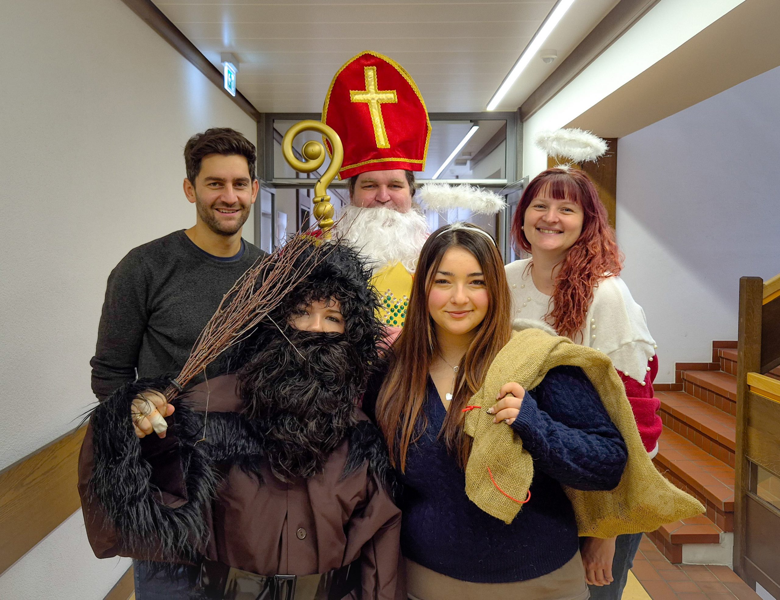 Die fünften und sechsten Klassen unserer Schule bekamen heute Besuch vom Nikolaus. Zusammen mit unseren Schülersprecherinnen und den Beratungslehrkräften verteilte er in den Klassenzimmern Mandarinen und Schokonikoläuse. Bevor er die Süßigkeiten verteilte, las er den Klassen aus seinem Goldenen Buch vor, in dem zum Glück nur wenige mahnende und sehr viele lobende Worte standen.